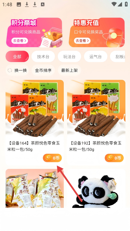 1、在積分商城頁(yè)面,可查看需0幣兌換的商品,如【設(shè)備164】茶顏悅色零食玉米粒等。