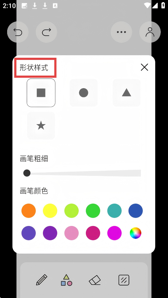 4、在【形狀樣式】面板中,可選擇方形、圓形等形狀,還能調(diào)整【畫筆粗細(xì)】和【畫筆顏色】。