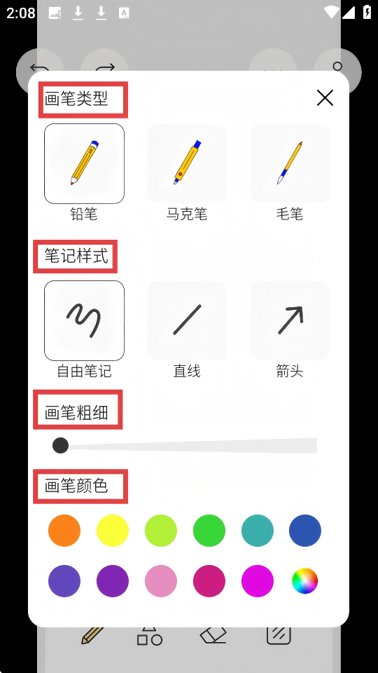 2、在面板中選擇【畫筆類型】、【筆記樣式】,并調(diào)整【畫筆粗細(xì)】和【畫筆顏色】。
