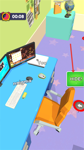 3、當(dāng)追擊者靠近時(shí),點(diǎn)擊【HIDE!】按鈕隱藏角色,同時(shí)利用移動(dòng)鍵調(diào)整位置,避免被發(fā)現(xiàn)。
