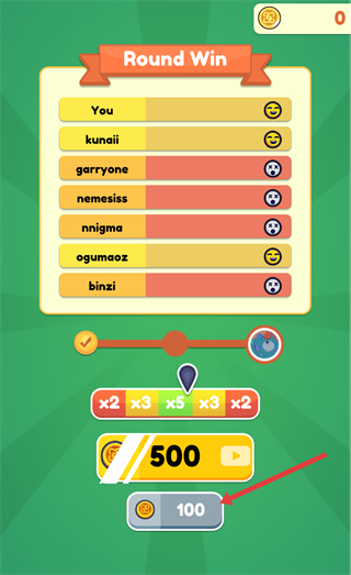 4、成功躲避后獲得【Round-Win】,點(diǎn)擊領(lǐng)取【100-金幣】獎(jiǎng)勵(lì),結(jié)束當(dāng)前回合并推進(jìn)關(guān)卡。