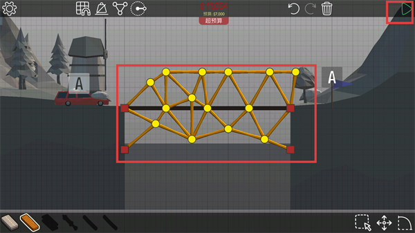 2、在結構搭建界面,用【木材】構建穩固橋梁,確保車輛安全通過,點擊右上角綠色按鈕。