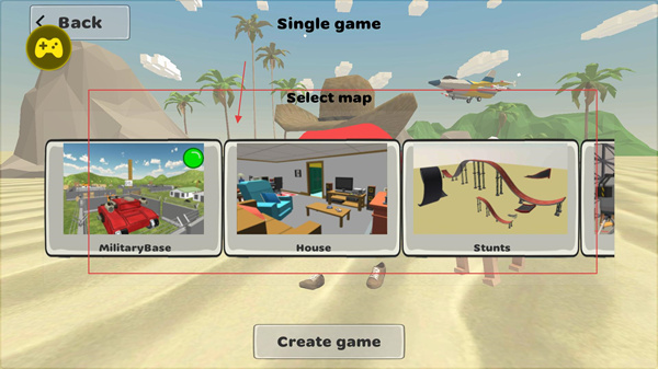 2、在單人模式下該模式支持選擇不同地圖(如MilitaryBase、House等),點(diǎn)擊【Creategame】可開(kāi)啟對(duì)應(yīng)地圖的對(duì)局。