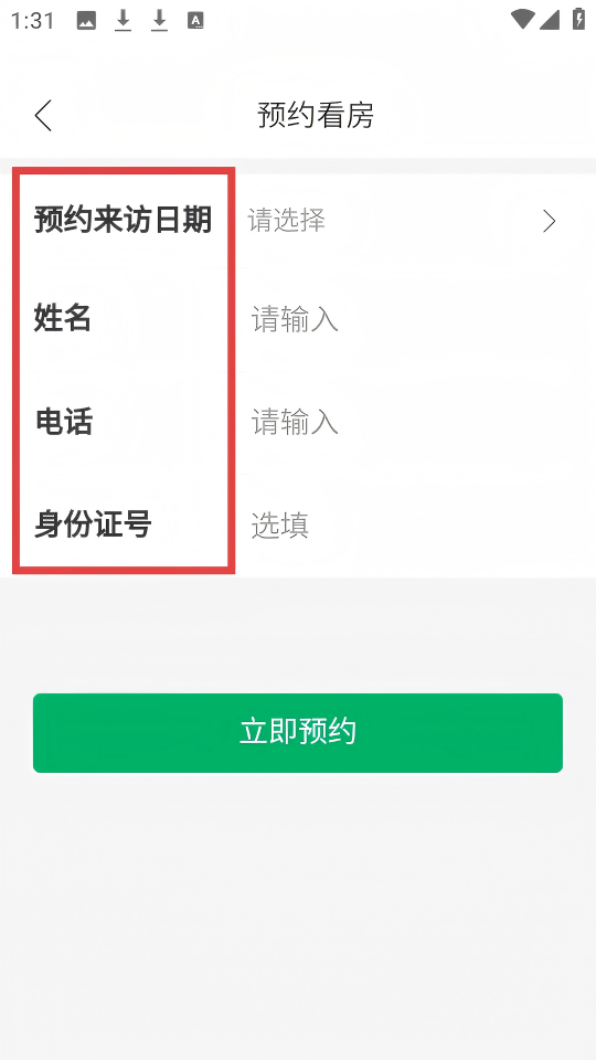 4、在預約看房頁面,填寫【預約來訪日期】【姓名】【電話】【身份證號】后,點擊【立即預約】完成預約。