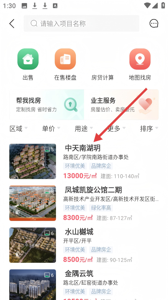2、在樓盤列表頁,點擊【中天南湖玥】,進入該樓盤詳情頁。