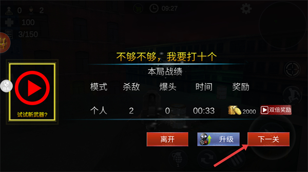 4、本局戰績顯示【殺敵-2】,點擊【下一關】進入新關卡。