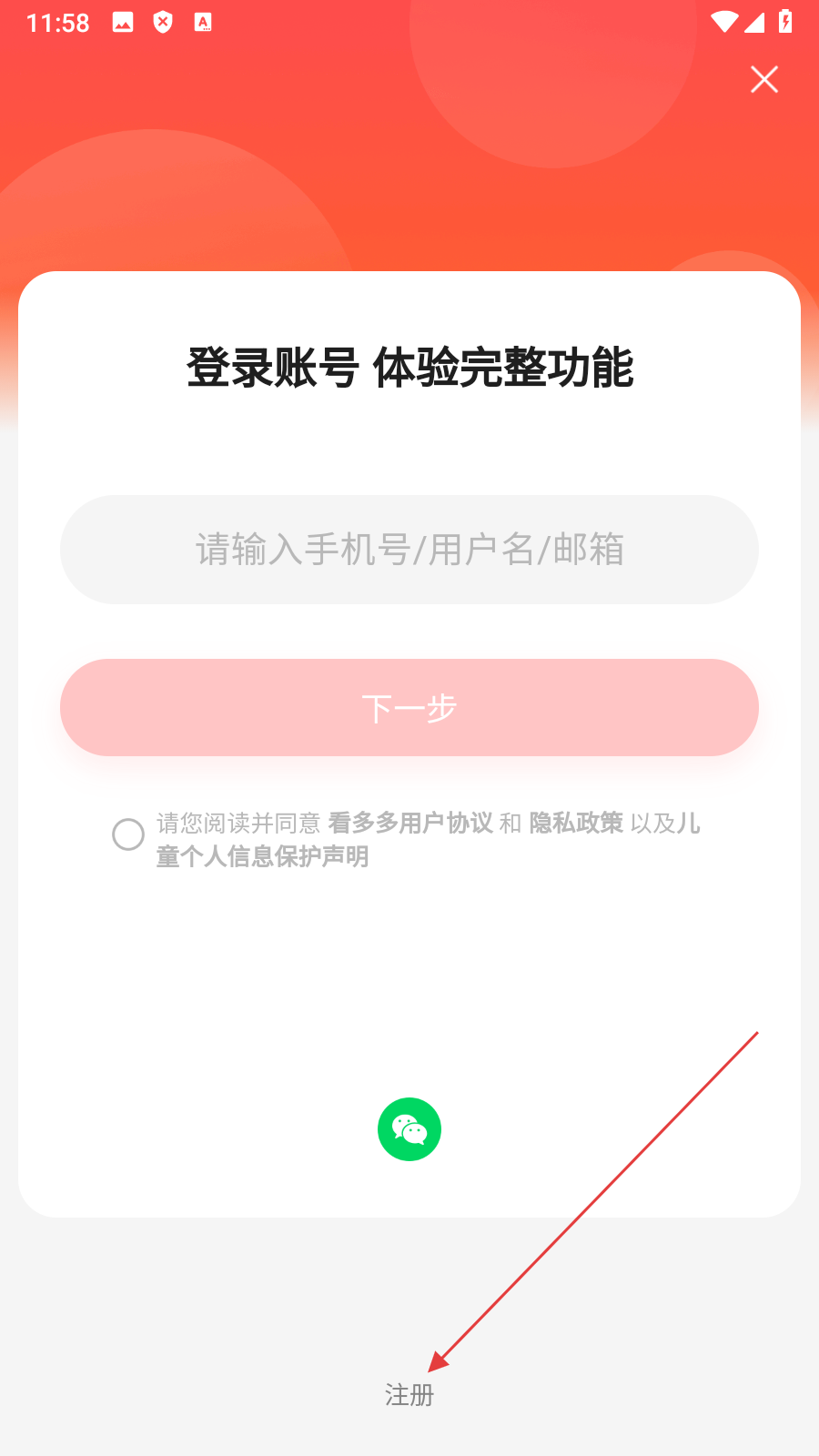 3、在登錄注冊頁面,點擊【注冊】,進入賬號注冊頁面。