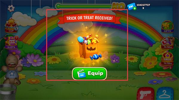 3、獲得【TRICK-OR-TREAT-RECEIVED!】提示后,點擊【Equip】按鈕裝備該道具,提升攻擊效果。