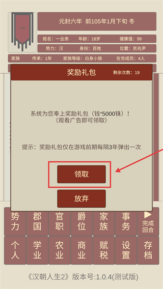 2、遇到【獎勵禮包】時建議領取,觀看廣告獲取【錢5000銖】作為初始資金用于務農或經商前期投入。