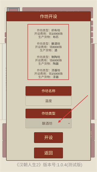 3、開設作坊時可選擇【制陶坊】或【釀酒坊】,依現有資金選低費用類型生產貨物積累財富擴展業務。
