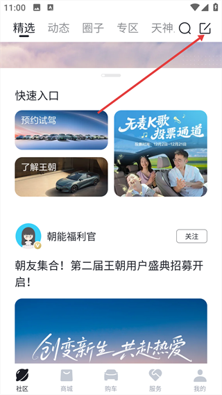 2、在【社區(qū)】頁面的右上角,點(diǎn)擊發(fā)布圖標(biāo)按鈕。