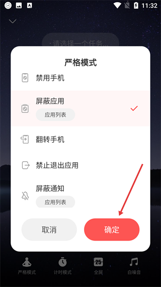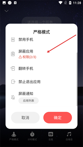 4、權限授權完成后回到【嚴格模式】彈窗,點擊底部【確定】按鈕,完成屏蔽設置。
