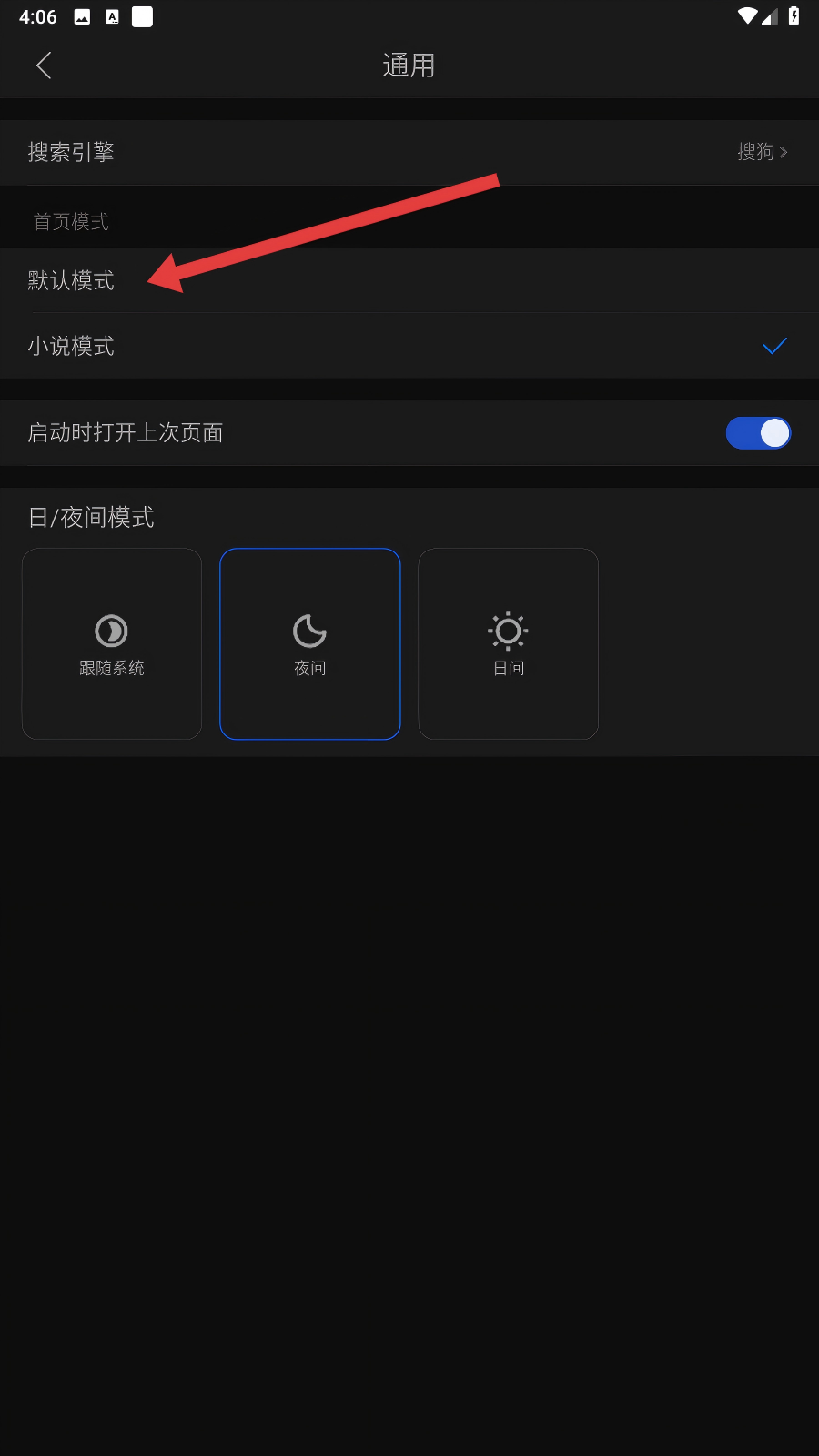 4、在通用設置頁面,點擊【默認模式】,就能把瀏覽器改成默認模式,方便日常使用哦。