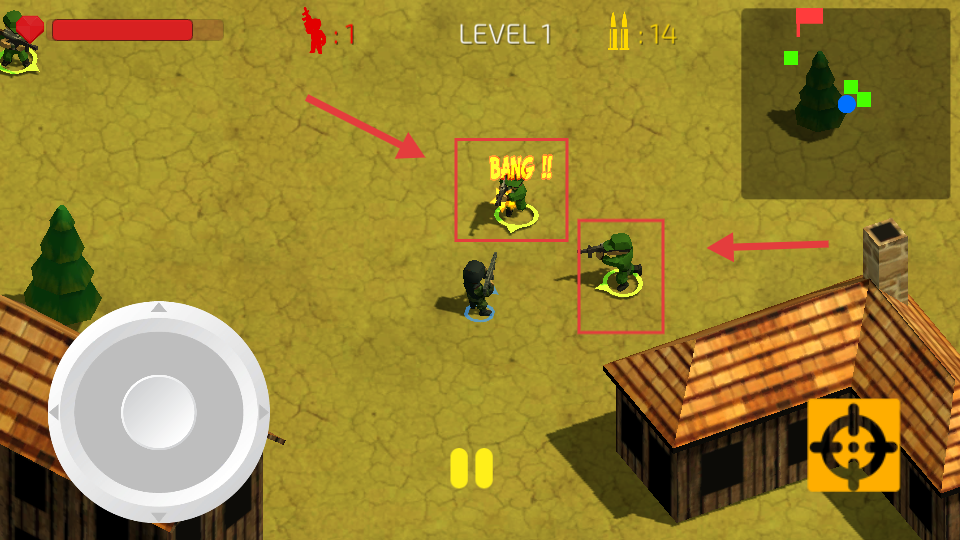 2、【LEVEL-1】戰斗時,用左側搖桿控制移動,瞄準紅色框內的敵人,點擊右側射擊按鈕消滅他們。