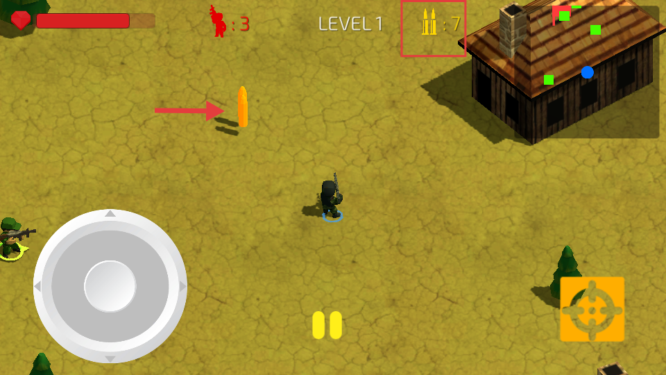3、【LEVEL-1】中若【子彈數-7】不足,靠近地面橙色補給物補充彈藥,繼續應對剩余敵人。