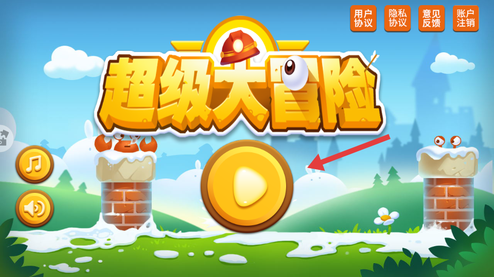 1、游戲主界面點擊中間【金色-開始按鈕】,進入【超級大冒險】關卡,注意左上角有音樂和音效開關可調節。