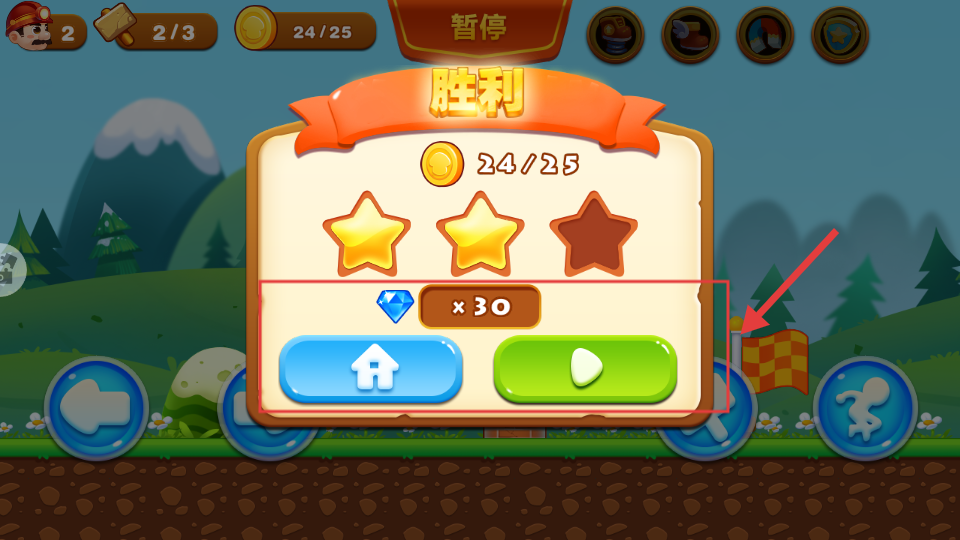 4、勝利界面領取【鉆石×30】獎勵后,點擊右側【綠色-繼續按鈕】,可進入下一關挑戰。