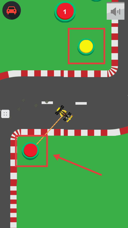 2、游戲中需點擊【紅色-按鈕】,通過繩索連接控制賽車移動,完成轉彎等操作。
