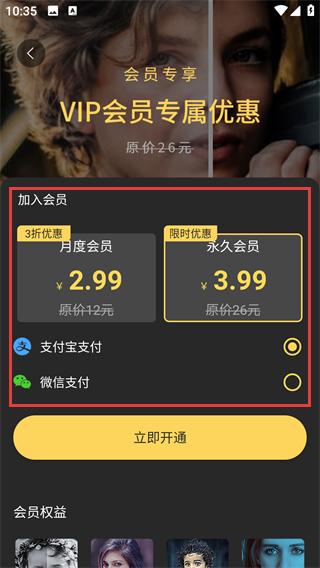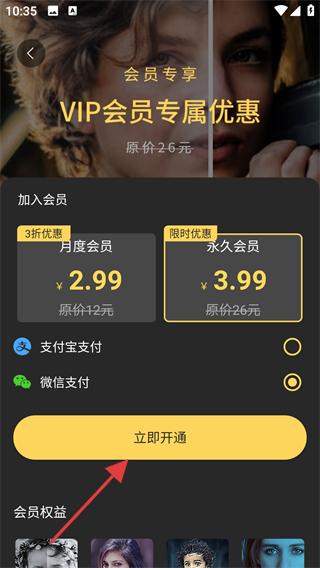 3、在會員界面選擇目標(biāo)套餐(如月度/永久會員),選定支付方式(支付寶/微信)。