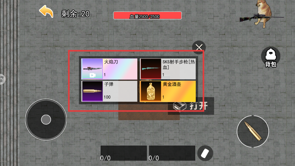 3、打開物資箱后會獲得【火焰刀】【SKS射手步槍-熱血】【子彈-100】【黃金酒壺】等裝備,提升自身戰斗和生存能力。
