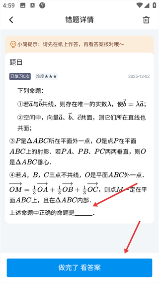 4、完成題目作答后,點擊【做完了-看答案】按鈕,查看該錯題的正確解析,完成錯題復盤。