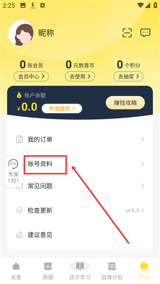 2、進入【個人】頁面后,點擊【賬號資料】選項,即可進入賬號資料的詳細設置界面。