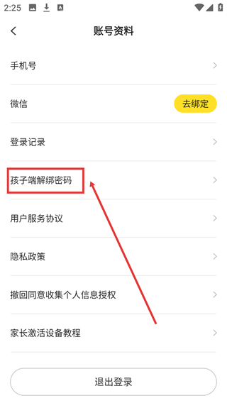 3、在【賬號資料】頁面,選擇【孩子端解綁密碼】選項并點擊,進入該密碼的設置界面。