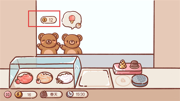 2、利用制作工具(如華夫餅機)制作多樣的冰淇淋,滿足顧客的不同需求,提升單次交易的收益(如獲得$12的金幣收益)。