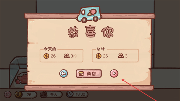 4、每日經(jīng)營結束后,可查看當天的收益和顧客接待情況(如總計$26收益、接待3位顧客),根據(jù)經(jīng)營數(shù)據(jù)調(diào)整后續(xù)的經(jīng)營策略。