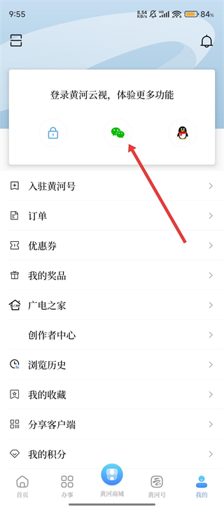 2、在【我的】頁面,選擇【微信】圖標登錄黃河云視呀。