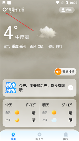 2、軟件會自動播報當前的天氣和最近十五天的天氣情況,點擊如圖所示的位置即可關閉語音播報。