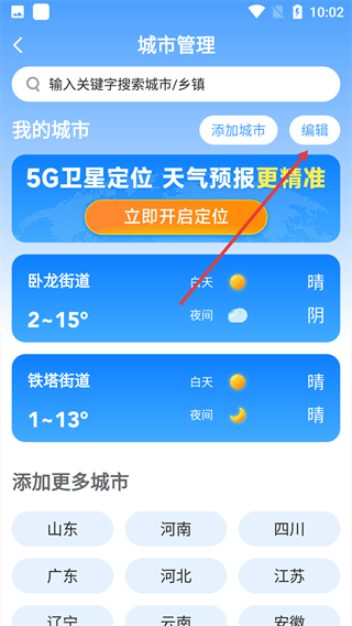 2、在城市管理頁面,點擊右上角【編輯】按鈕。