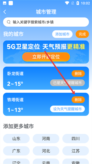 3、點擊【鐵塔街道】對應的刪除按鈕,將該城市從已添加列表中移除。