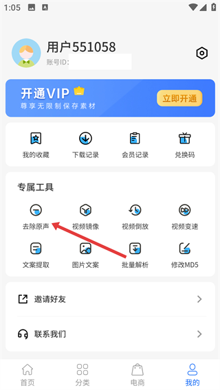 2、在【我的】頁面,找到【去除原聲】工具,點擊進入呀。