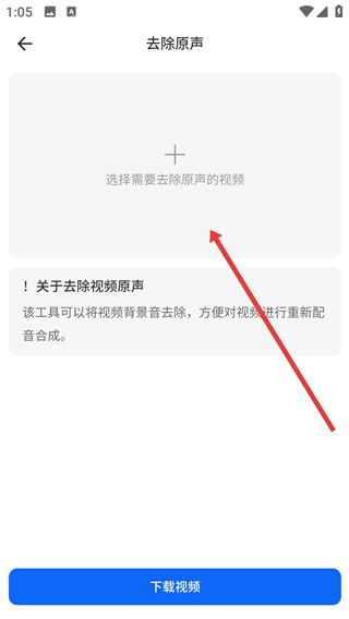 3、進入【去除原聲】頁面,點擊【+】,選擇需要去除原聲的視頻,準備進行處理哦。