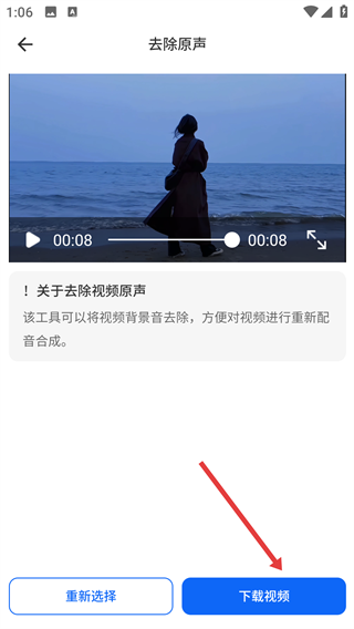 4、視頻選擇好后,點擊【下載視頻】,就能得到去除原聲的視頻,方便后續配音合成啦。