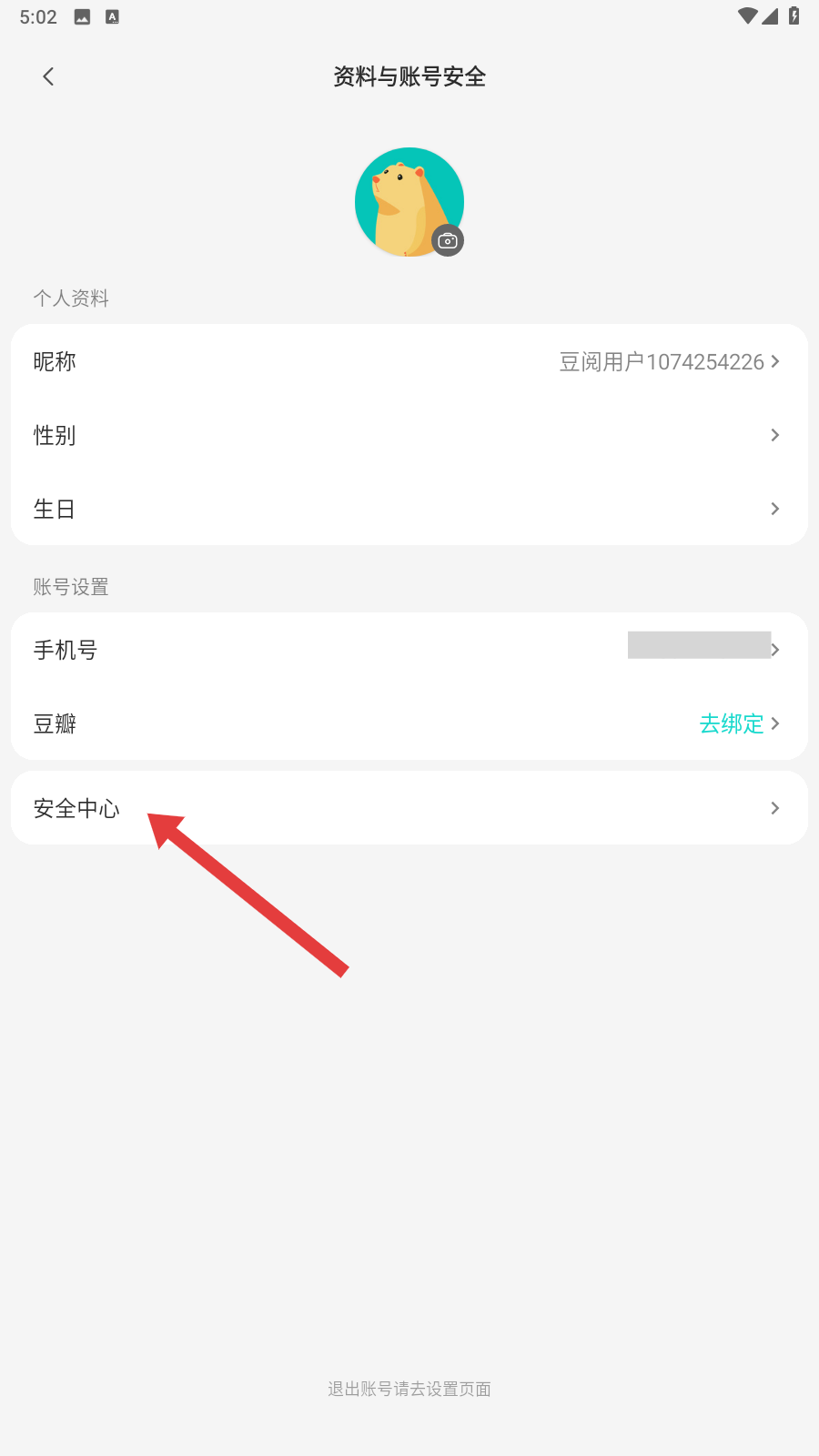3、在【資料與賬號安全】界面,點擊【安全中心】,進入安全管理界面呢。