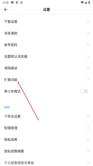 3、在設置界面的選項列表里,找到擴展功能選項并點擊。