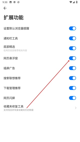 4、在擴展功能頁面找到網頁懸浮窗選項,點擊對應的開關。