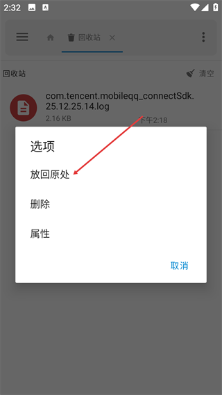 4、在“選項”彈窗中,選擇“放回原處”選項,即可將該文件恢復至其原始存儲位置。