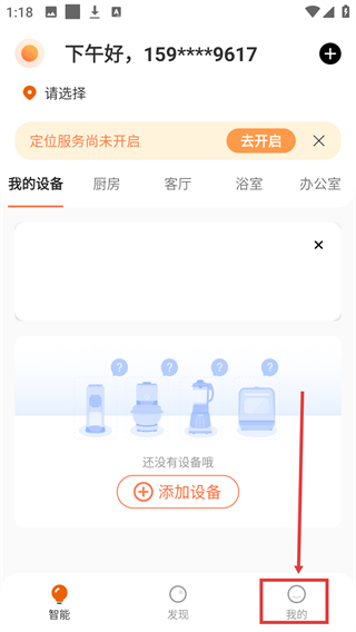 1、進入界面,可看到【我的設備】分類,當前無設備可點擊【添加設備】,點擊底部【我的】進入個人頁。