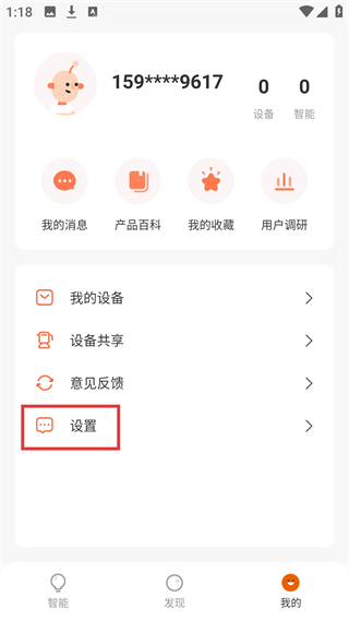 2、在個人頁能看到綁定的手機號,還有【我的消息】【產品百科】等功能,點擊【設置】進入設置頁面。