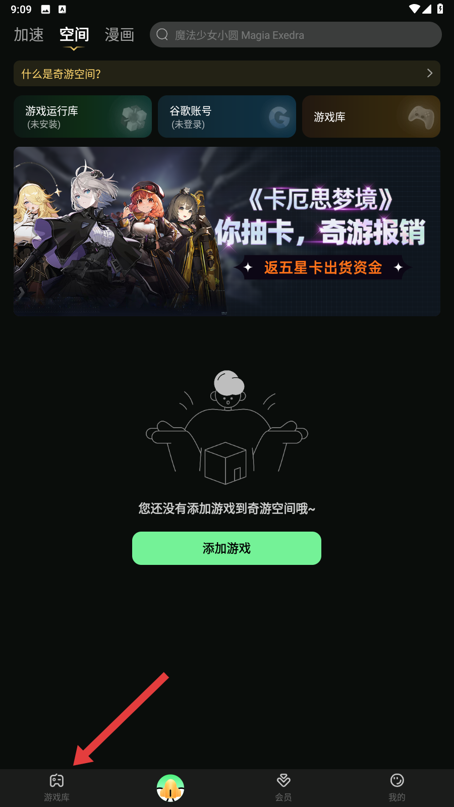 1、我們打開奇游加速器,點擊底部【游戲庫】,即可進入游戲列表頁面,尋找待下載軟件啦。