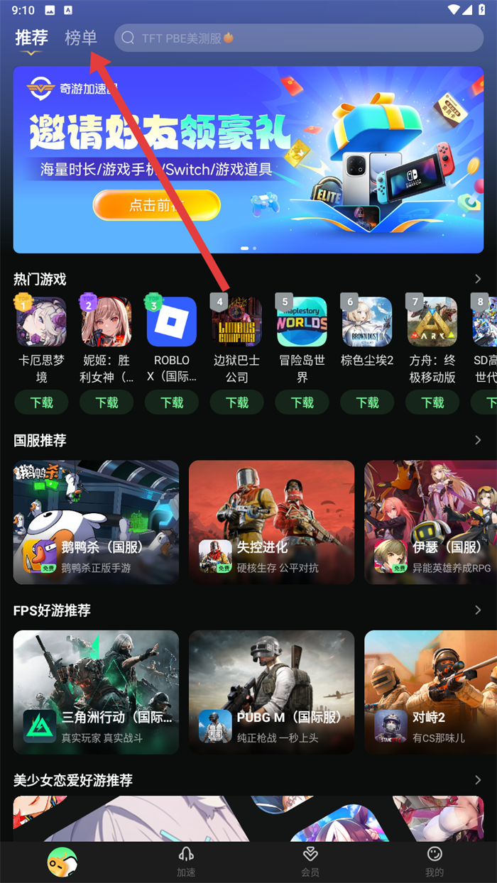 1、打開奇游加速器APP,在加速界面點擊上方的【奇游空間】;
