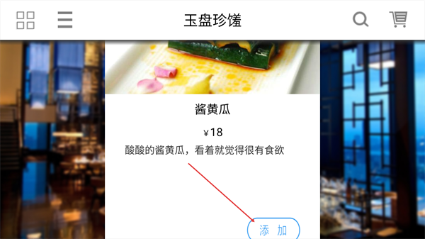 2、在分類菜品列表中,選定具體菜品,點擊“添加”按鈕,將該菜品加入點餐購物車。