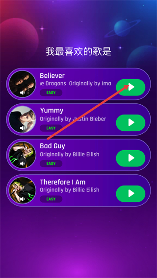 1、選擇喜歡的歌曲進入游戲,點擊綠色按鈕開始,跟隨音樂節奏進行后續的操作。