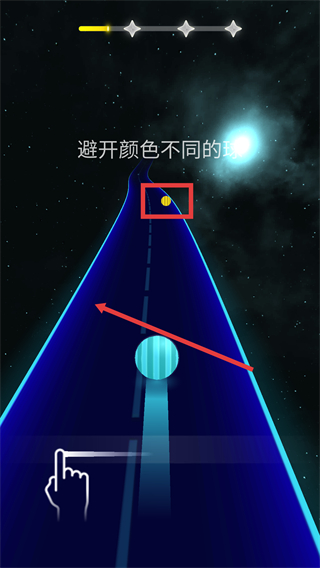 4、道路上會出現顏色不同的球體,需及時調整球體位置,避開這些顏色不同的球保持進度。