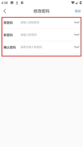 4、進入【修改密碼】頁面后,依次填寫【原密碼】-【新密碼】-【確認密碼】,填寫完成后點擊右上角的【保存】按鈕。
