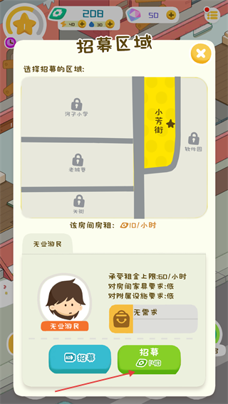 1、在【招募區域】選擇租客(如無業游民),點擊【招募】按鈕發起邀約,可享租金+50/小時。