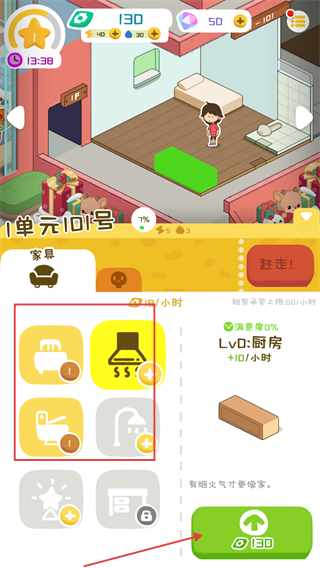 4、在【單元101號】界面,選擇【廚房】等家具,點擊對應按鈕花費資源解鎖布置房間。